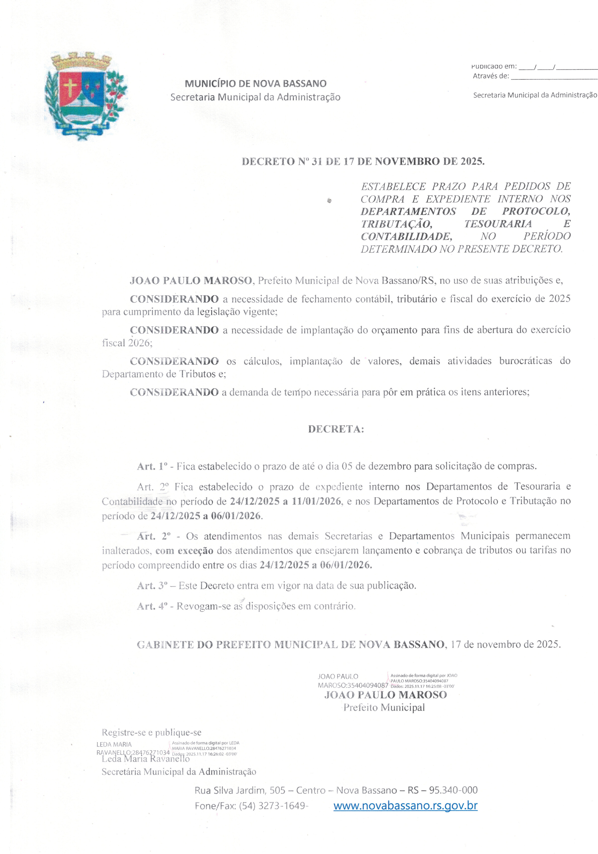 Decreto nº 31 de 17 de novembro de 2025, estabelece prazo para pedidos de compra e expediente interno nos Departamentos de Protocolo, Tributação, Tesouraria e Contabilidade, no período determinado no presente decreto.