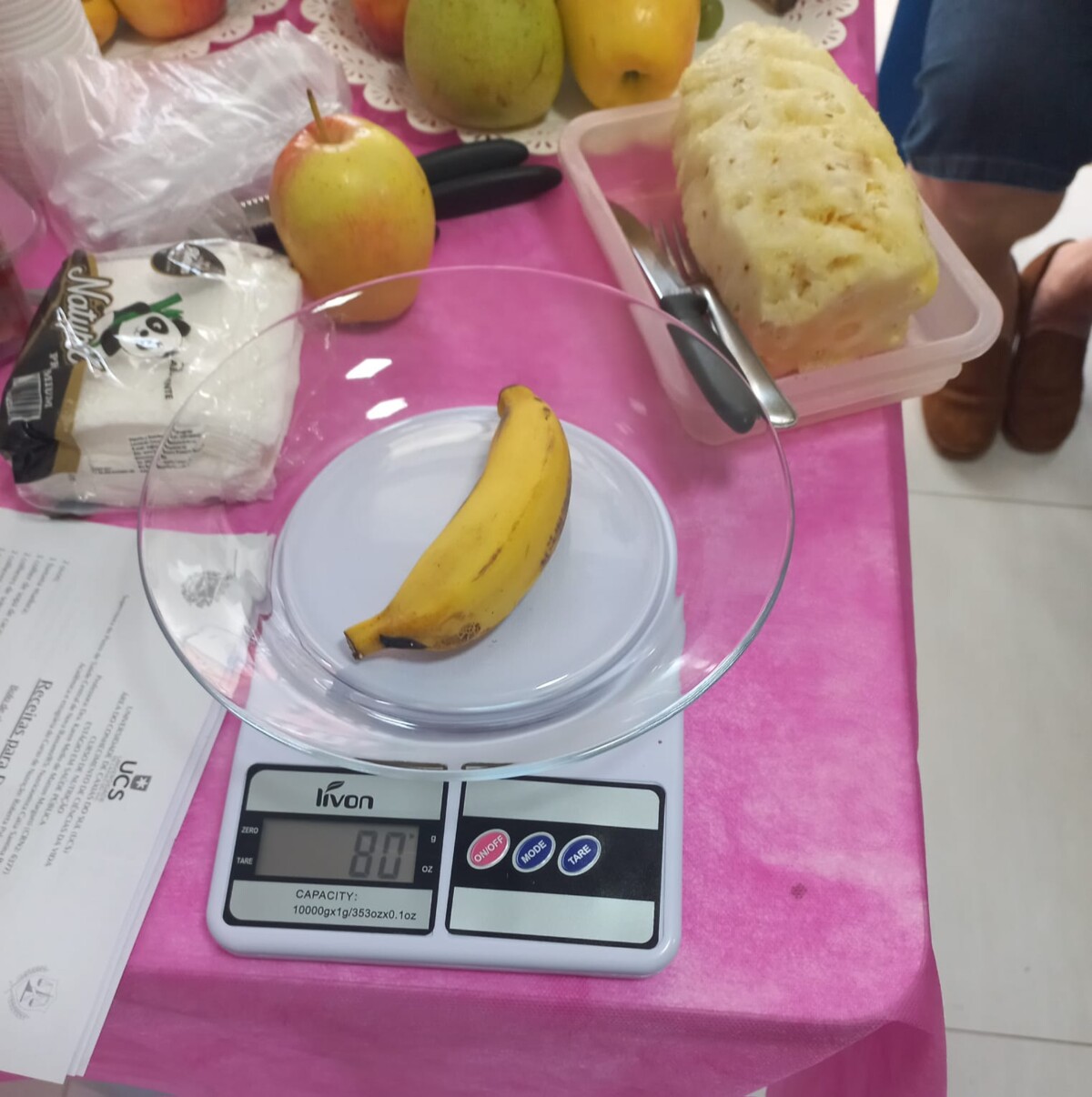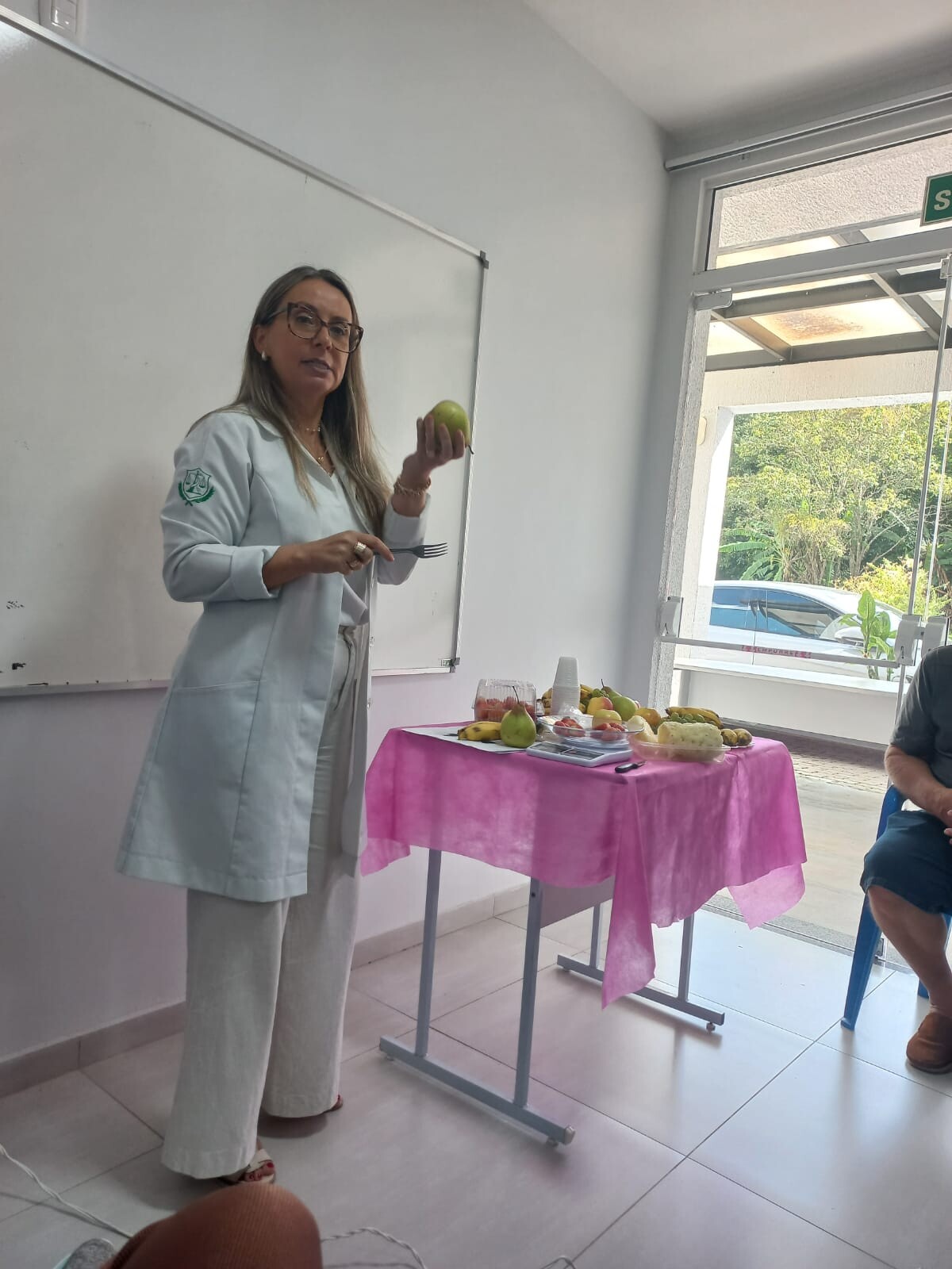 Houve um atividade de Educação em saúde com uma palestra com a nutricionista Cátia, no qual foi abordado o tema Alimentação Saudável, e de forma prática, mostrou o correto consumo das frutas, dentro das porções necessárias.