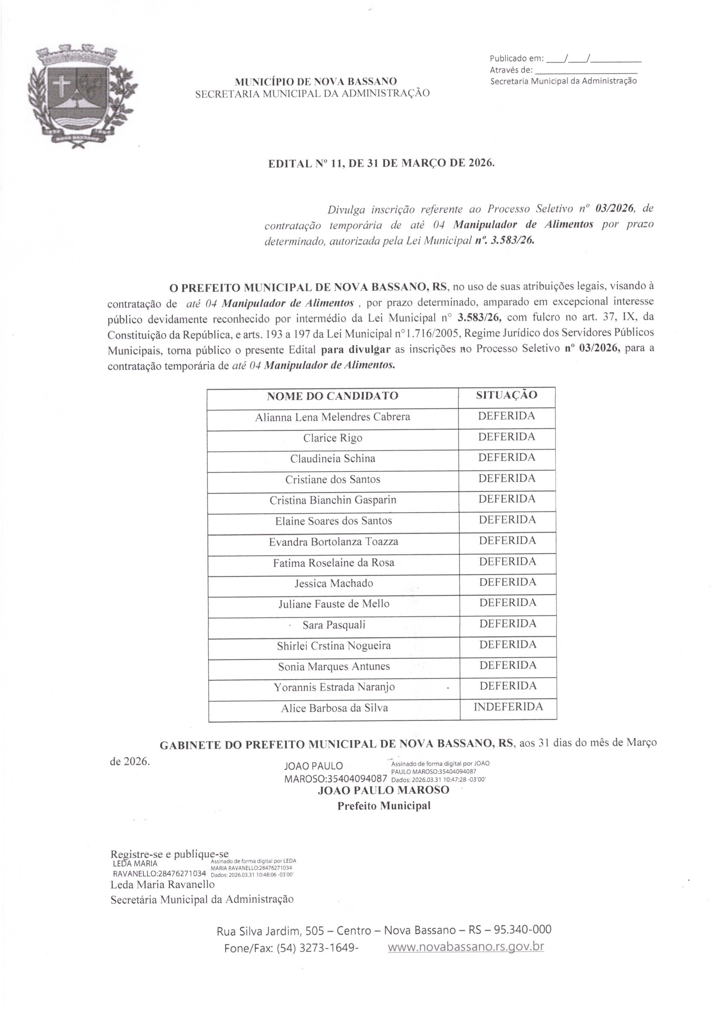 Divulga inscrição referente ao Processo Seletivo nº 03/2026, de contratação temporária de até 04 Manipulador de Alimentos por prazo determinado, autorizada pela Lei Municipal nº. 3.583/26.