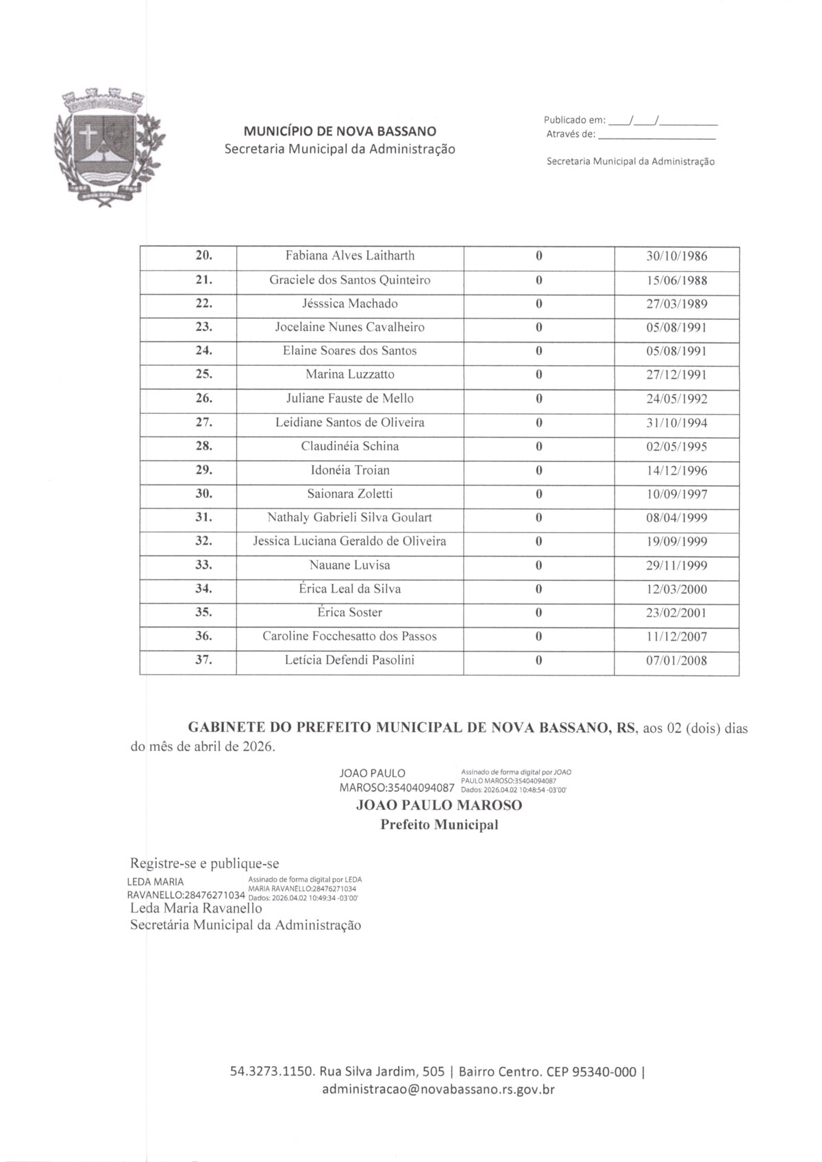 Divulga resultado final referente ao Processo Seletivo nº 04/2026, de contratação temporária de até 30 Monitor de Educação Infantil por prazo determinado, autorizada pela Lei Municipal nº. 3.582/2026.