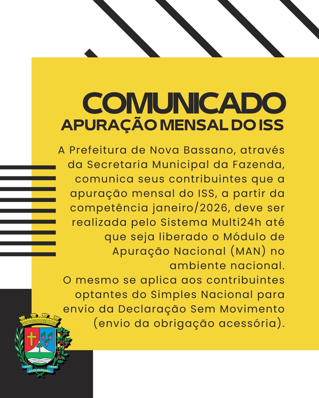 A Prefeitura de Nova Bassano, através da Secretaria Municipal da Fazenda, comunica seus contribuintes que a apuração mensal do ISS , a partir da competência janeiro/2026 , deve ser realizada pelo Sistema Multi24h até que seja liberado o Módulo de Apuração Nacional (MAN) no ambiente nacional.