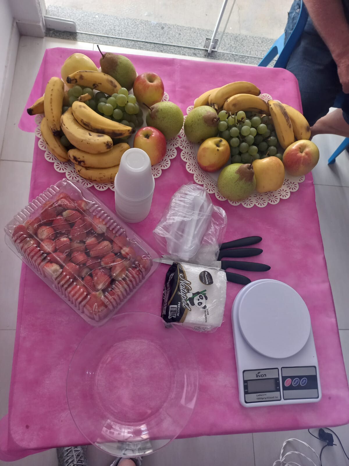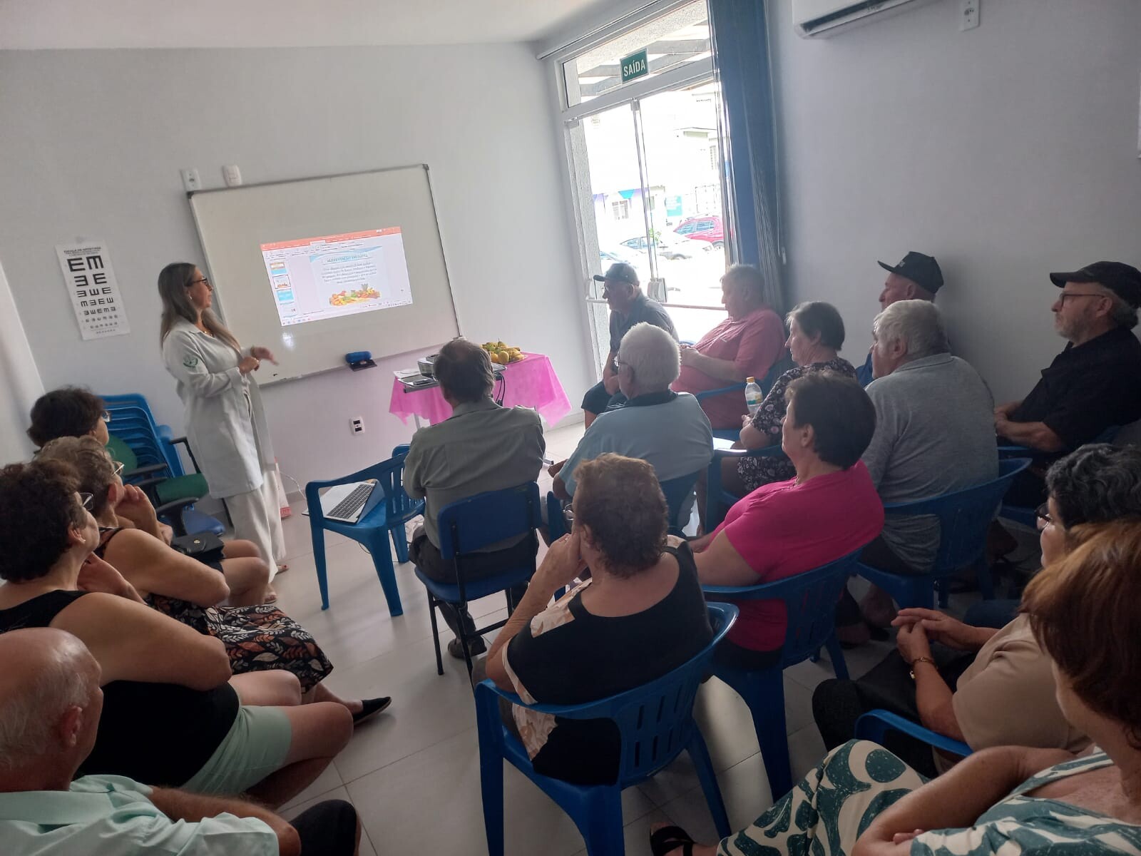 Houve um atividade de Educação em saúde com uma palestra com a nutricionista Cátia, no qual foi abordado o tema Alimentação Saudável, e de forma prática, mostrou o correto consumo das frutas, dentro das porções necessárias.