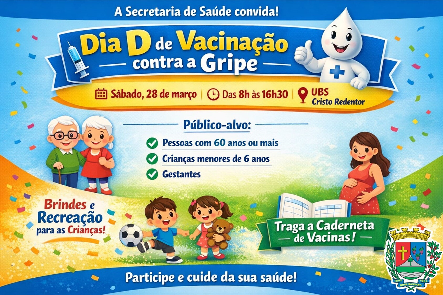 A Secretaria de Saúde convida toda a comunidade de Nova Bassano para participar do Dia D de Vacinação contra a gripe.