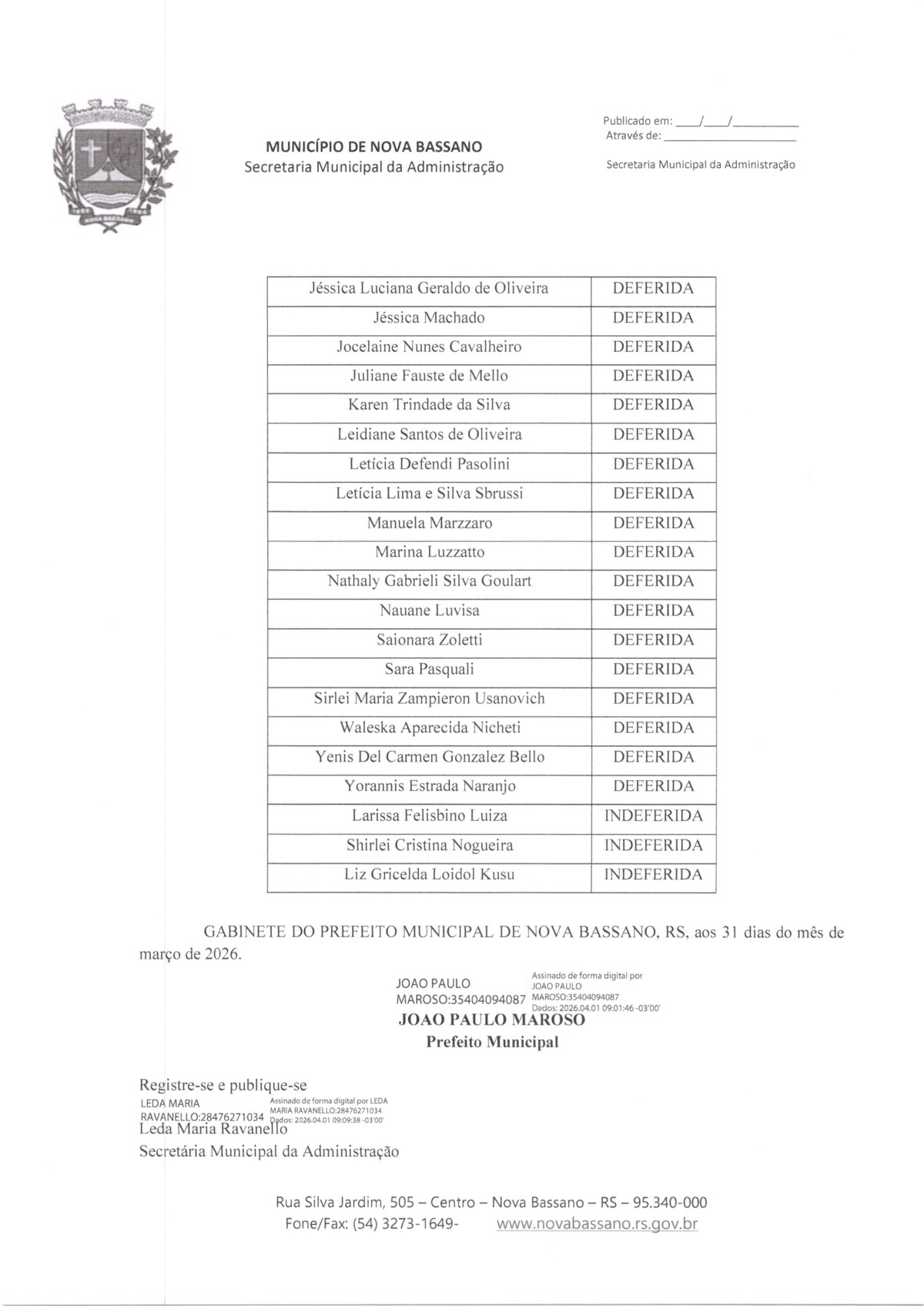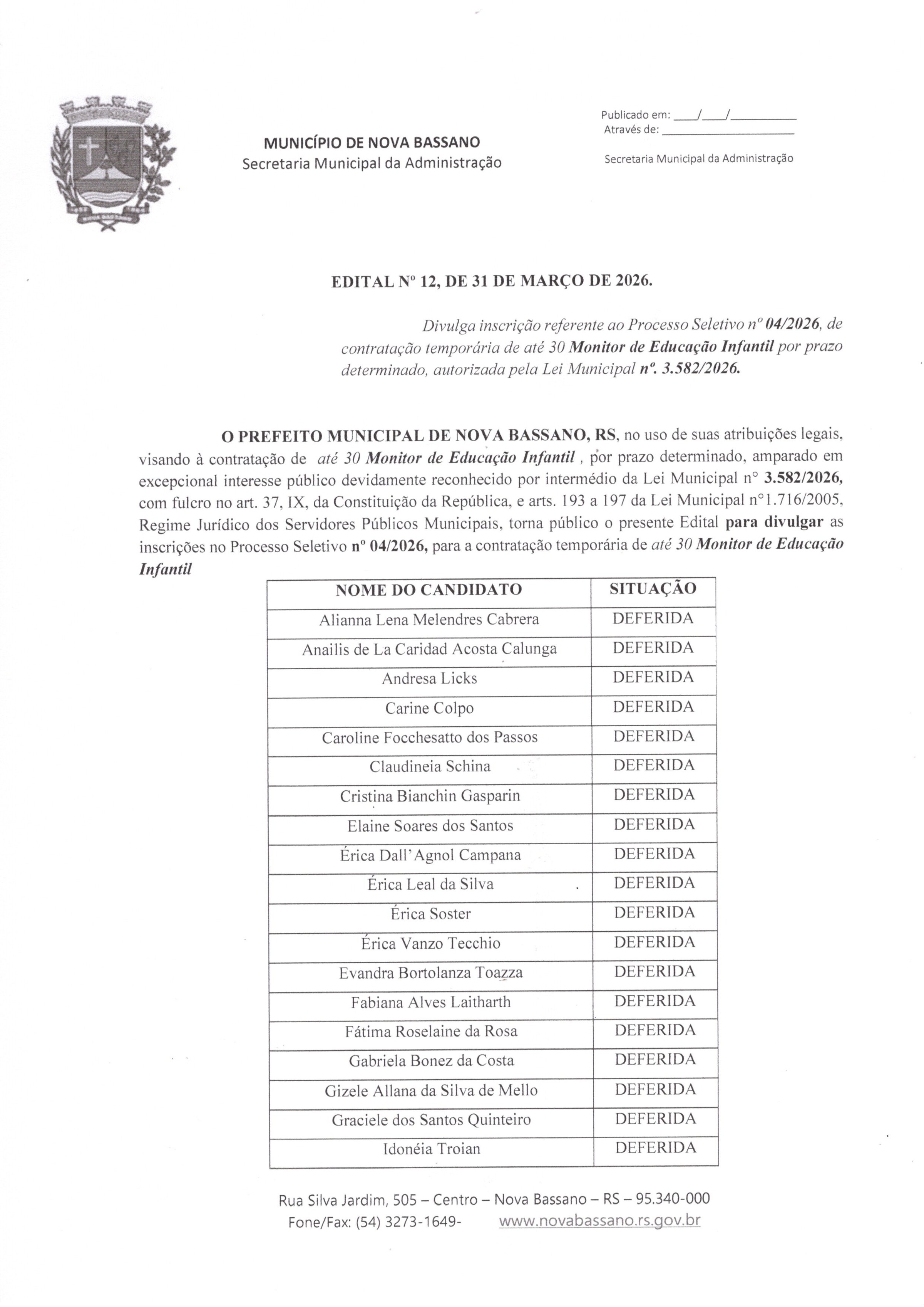 Divulga inscrição referente ao Processo Seletivo nº 04/2026, de contratação temporária de até 30 Monitor de Educação Infantil por prazo determinado, autorizada pela Lei Municipal nº. 3.582/2026.