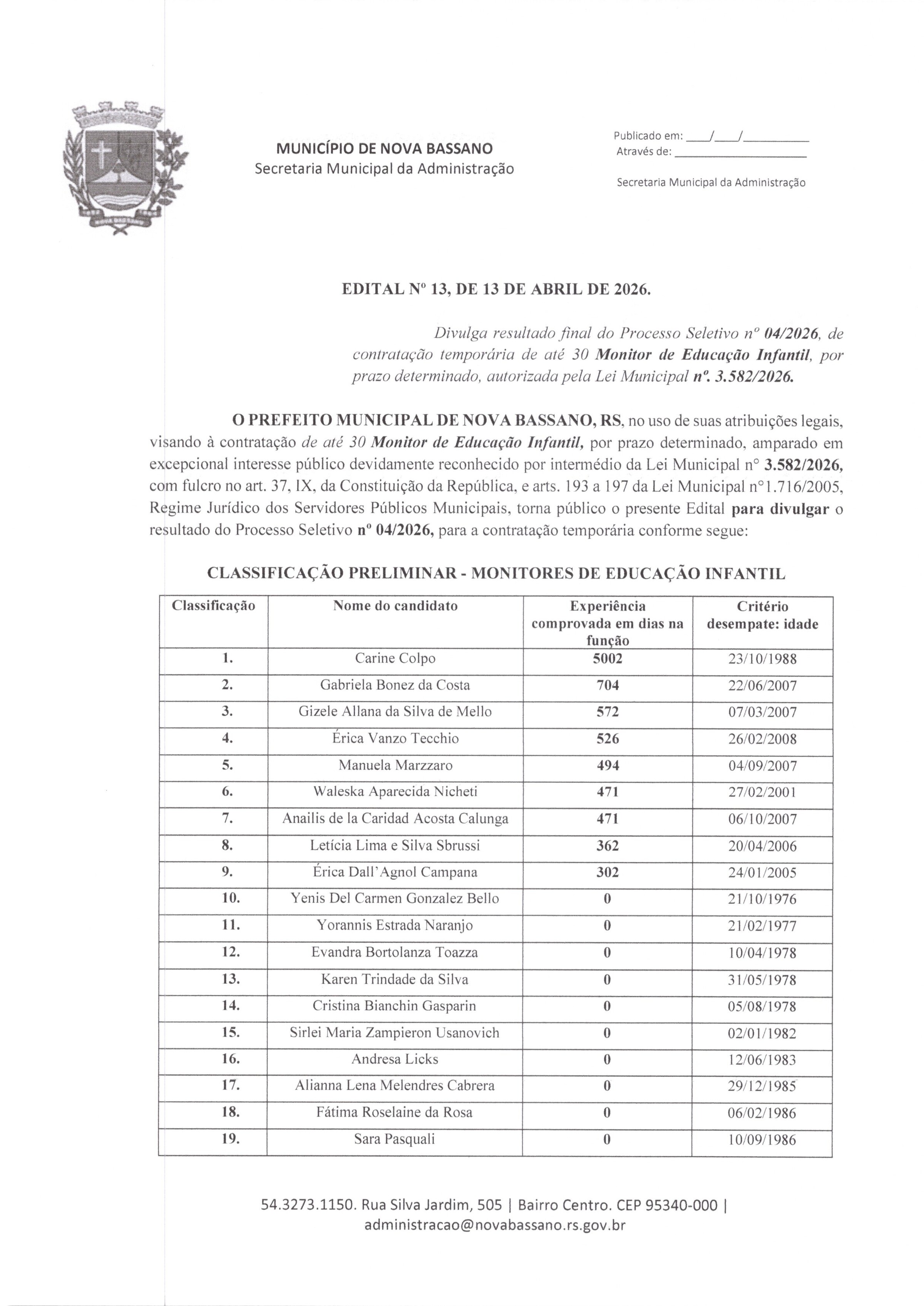 Divulga resultado final referente ao Processo Seletivo nº 04/2026, de contratação temporária de até 30 Monitor de Educação Infantil por prazo determinado, autorizada pela Lei Municipal nº. 3.582/2026.